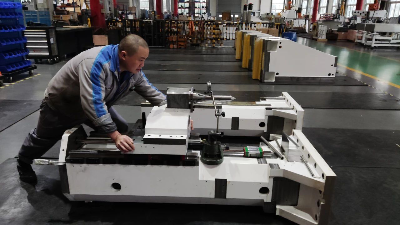 为确保参展机床按时完工,技术团队与装配技师紧密配合,从零部件的组装到机床的大件定位,每一道工序都严格把关,精益求精,紧密协作,展现出高度的责任感和团队凝聚力。